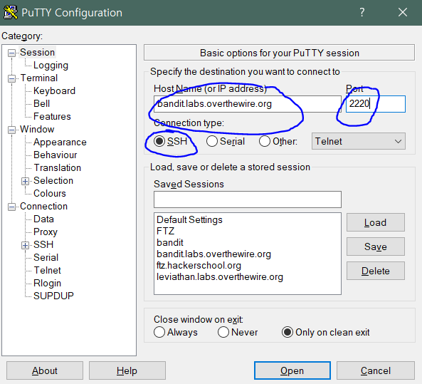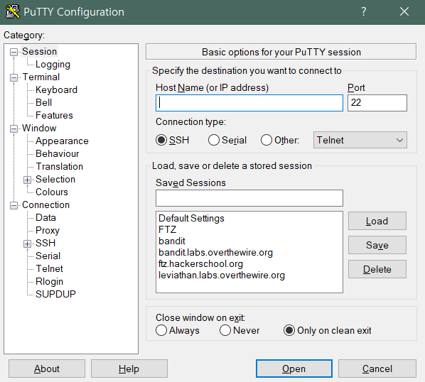 Putty를 실행하면 다음과 같은 화면이 뜹니다. 왼쪽창은 일단 무시하고, HostName(or IP address) 이 부분과 Port, 그리고 Connection type 이 부분만 보겠습니다. 우선 원격접속은 워게임 사이트 중 하나인 overthewire의 bandit 서버로 해보겠습니다. overthewire.org/wargames/bandit/