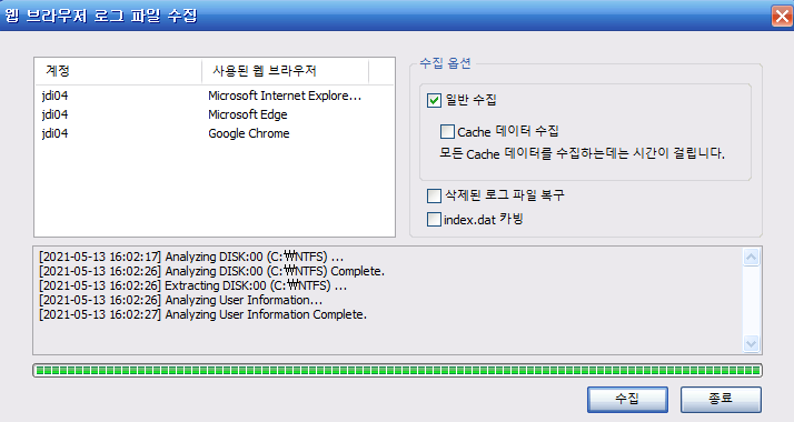 원래는 특정 파일 경로에 저장되어있는 웹 로그들을 직접 가져와 수집할 수 있지만 번거로우므로 툴 상에서 수집 기능을 통해 가져오는 것 입니다. 수집 옵션을 조정해 더 상세히 수집할 수 있지만 시간이 더 걸릴 수 있습니다.