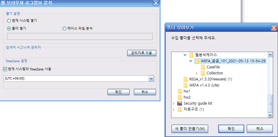 이후 종료를 누르면 방금 지정해둔 폴더에 로그 파일들이 저장되게 됩니다. 이제 로그를 분석하는 방법을 알아봅시다. 상단 바에서 파일 버튼을 누르고 로그 정보 분석을 누릅니다. 이후 폴더 열기를 선택해 지정해둔 케이스의 폴더 경로를 선택합니다. 이후 프로그램이 알아서 파일을 파싱해줍니다.(시간대는 분석하고자 하는 로그에 맞게 설정합니다.)