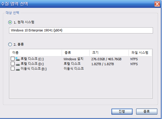 수집할때에는 현재 시스템에 있는 로그를 대상으로 할 수 있고, 이외에 마운트된 디스크 볼륨들에서 로그를 수집할 수도 있습니다. 일단 현재 시스템을 선택하고 진행을 누르겠습니다.